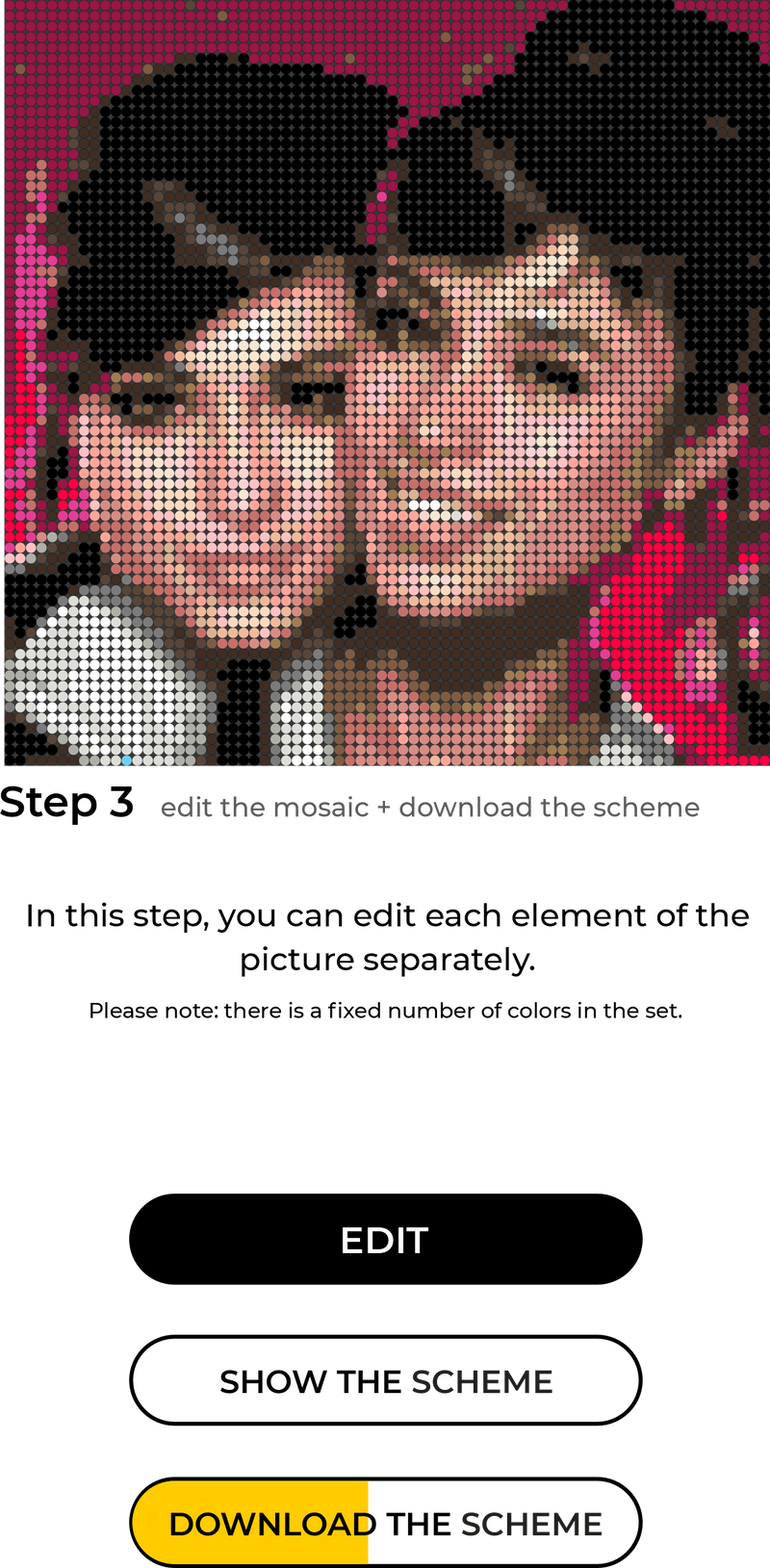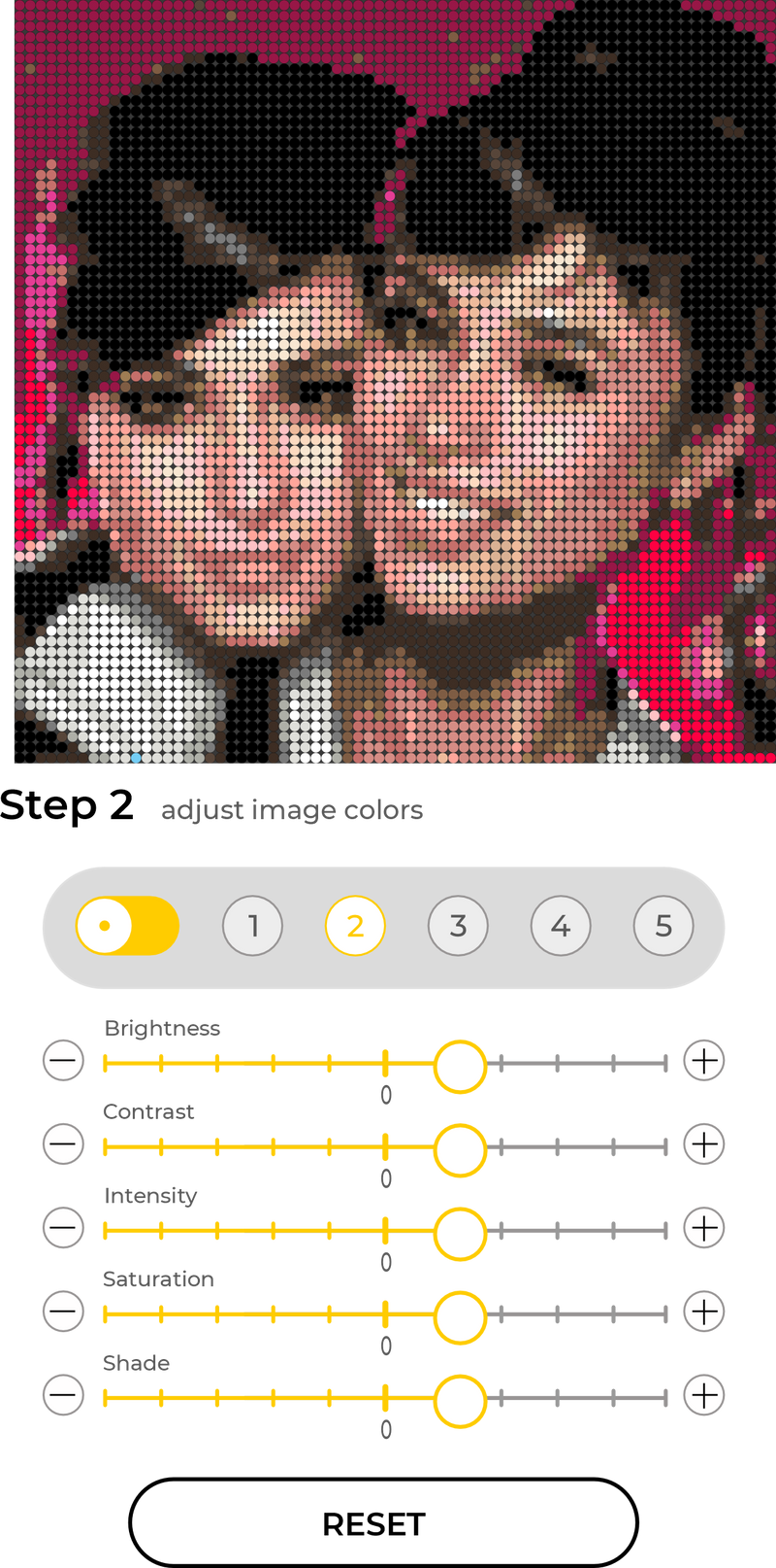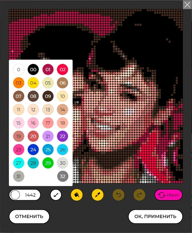 At this stage, your uploaded image is pixelated and transformed into a mosaic format. Here you can fine-tune filters and adjust colors to achieve the best look for your future artwork.